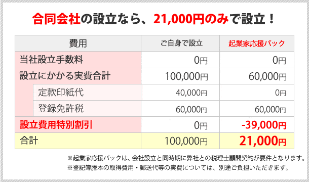 神奈川県での会社設立サービス。設立実績多数の辻・本郷税理士法人が、 手数料0円、143,000円のみで会社設立します。面倒な設立書類の作成と役所への提出はすべて代行します。 お客様には、申込書類に必要事項を書いていただいたくだけでOK。 さらに、電子定款を利用しますので、本来必要な収入印紙代40,000円が不要です。 土日の相談も可能です。自分でやるより「早い」「安い」「確実」です。まずは無料相談!